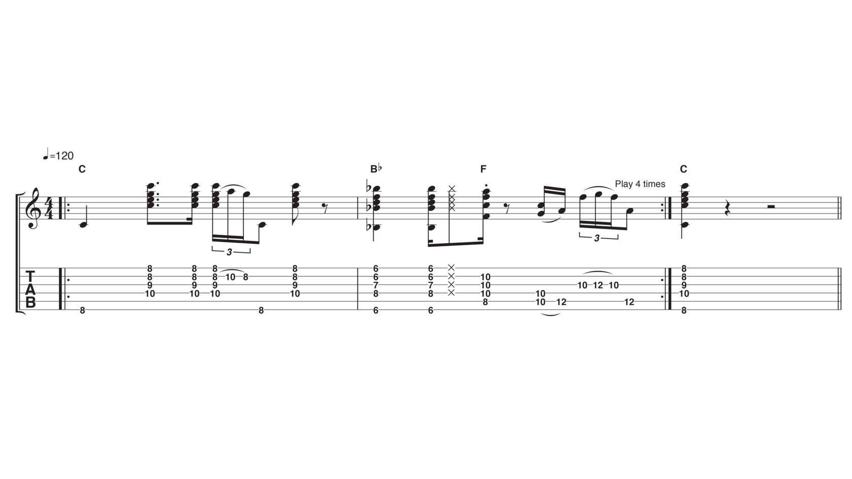 В приведённом выше примере зажимайте шестую струну большим пальцем — узкие грифы Fender Stratocaster и Gibson Les Paul с профилем Slim Taper позволят брать басовые ноты без неприятных ощущений.
